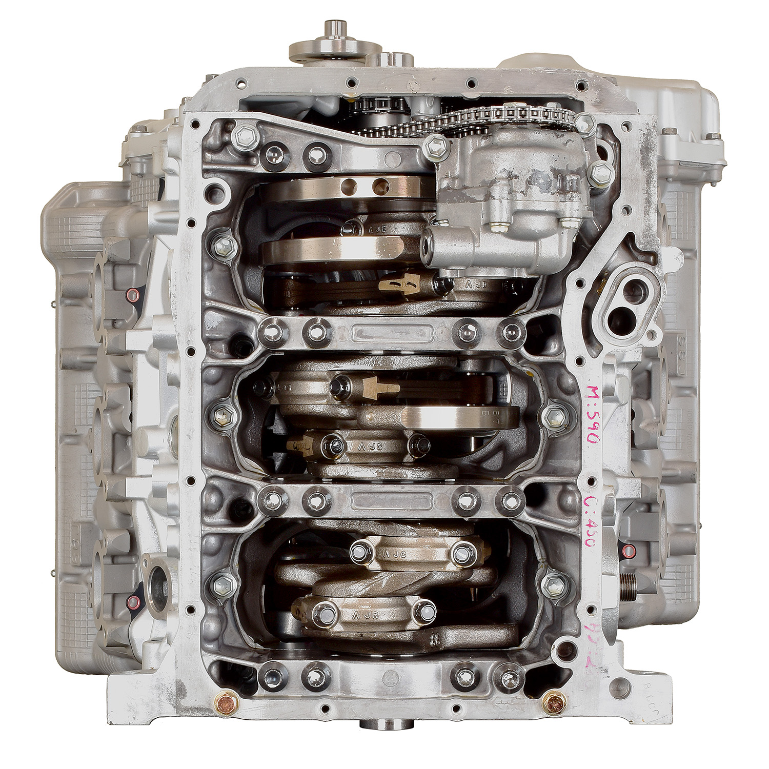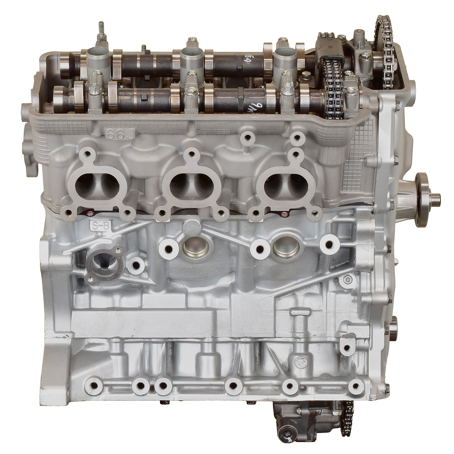 • Machining and New Parts – Deck surfaces are CNC machined and new parts are added. New parts inlcude bearings, pistons, rings, lifters, oil pump, gaskets, Viton™ valve seals, freeze plugs, galley plugs and either a new timing chain (with new tensioners) or a new timing belt (with new tensioner). If an engine has a timing-driven water pump, a new pump is installed.